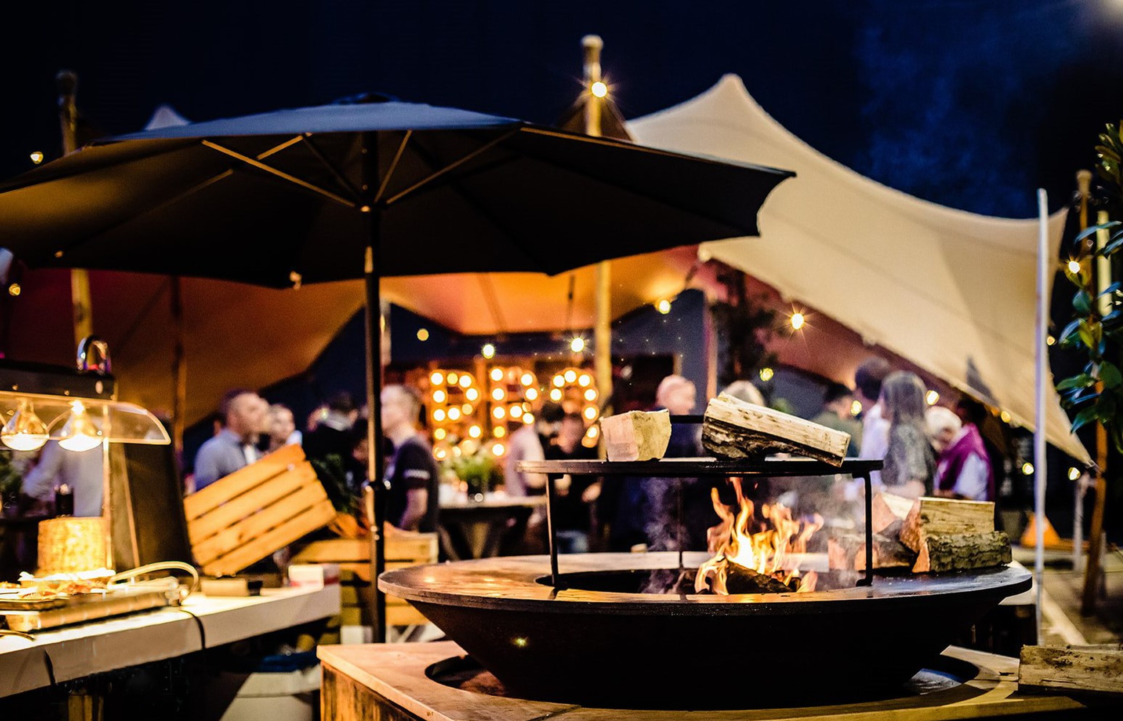Een sfeervolle marktsetting met kraampjes, vuurkorven, seizoensgerechten en warme dranken. Ideaal voor informele borrels of grootschalige bedrijfsfeesten.